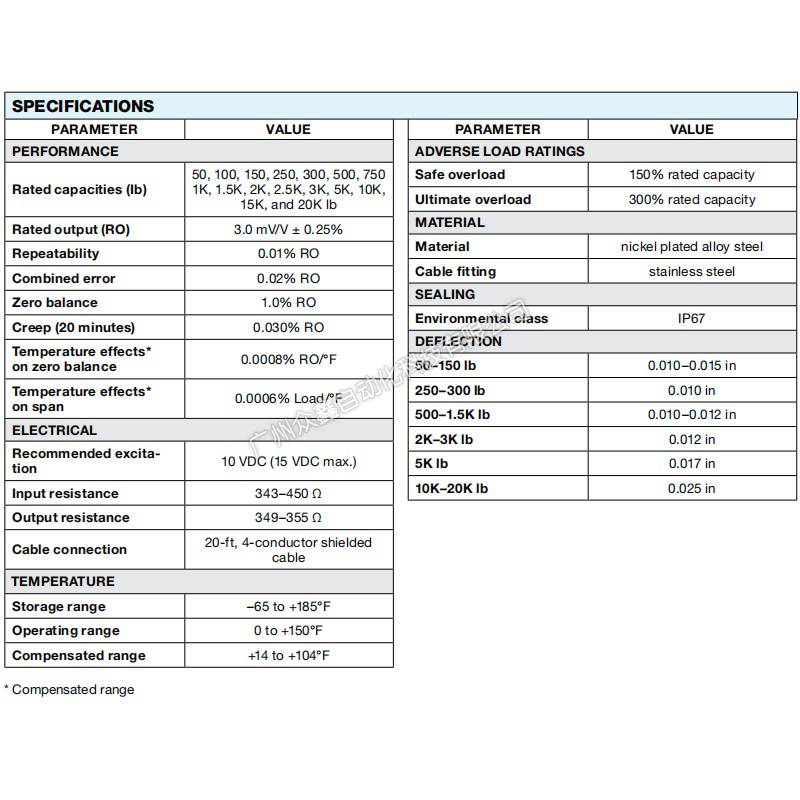(1)容量范围:50至20K磅(22.7至9K千克)