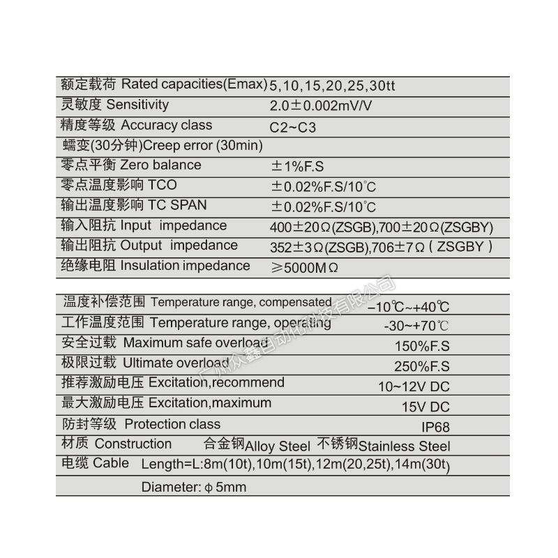 三、ZSGB称重传感器产品参数