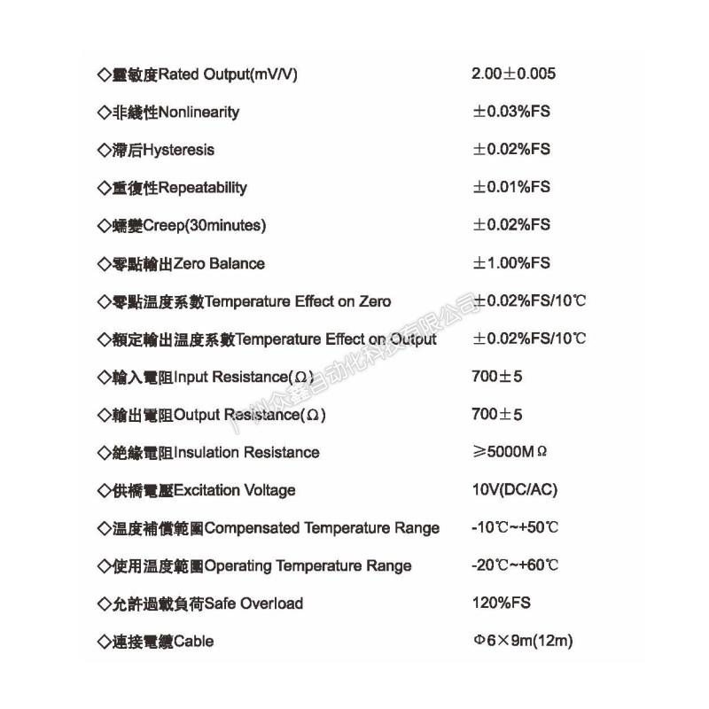 四、CP-4-20T称重传感器技术参数
