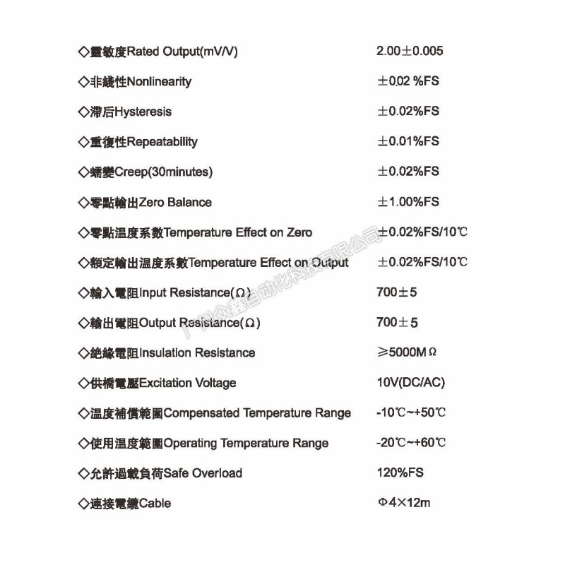 四、CP-15-10T称重传感器技术参数