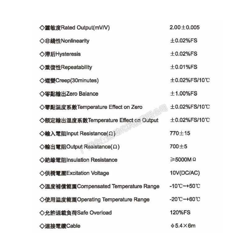 四、GF-12-2T称重传感器技术参数