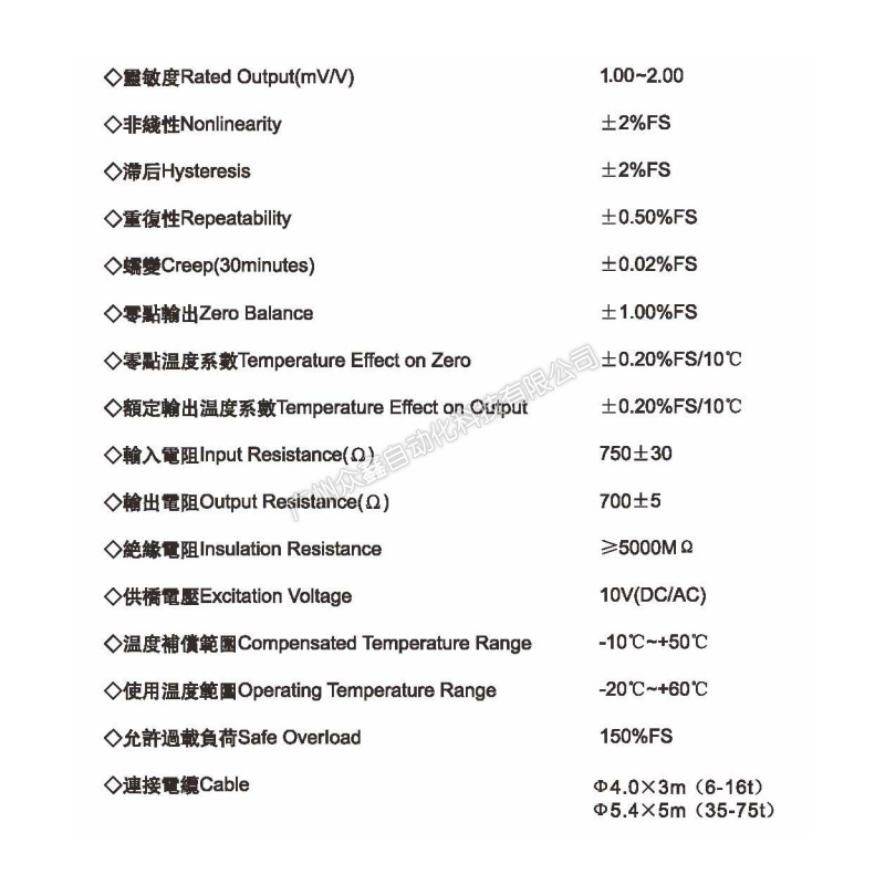四、GY-8-6T称重传感器技术参数