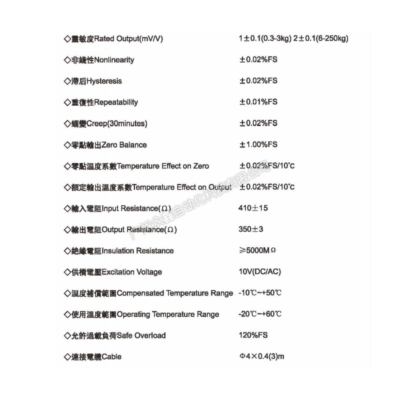 四、PE-1-300g称重传感器技术参数