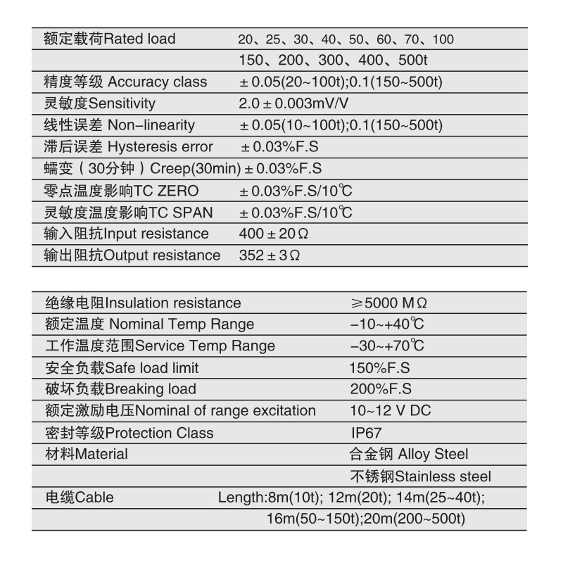 三、ZSE-500t称重传感器产品参数