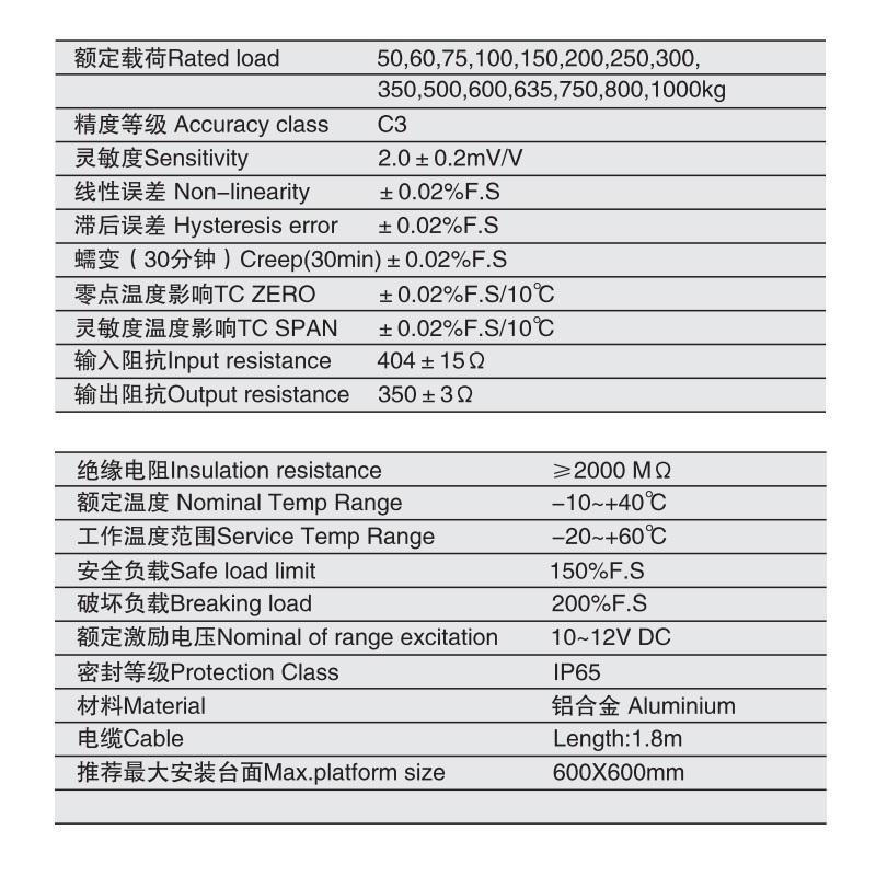 三、UDA-50kg称重传感器产品参数