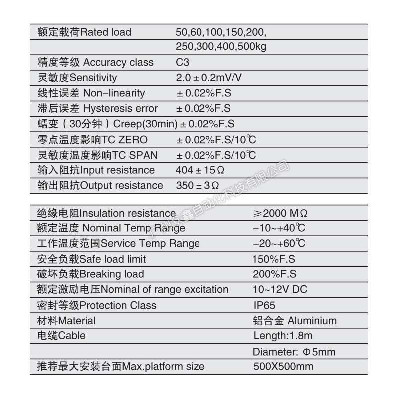 三、UDN-250kg称重传感器产品参数