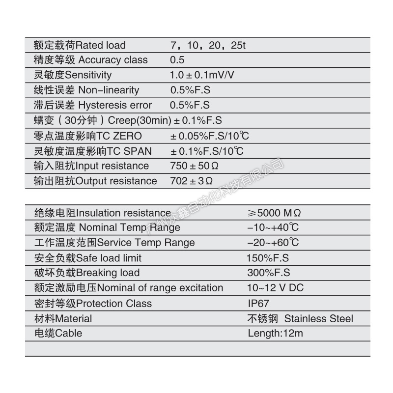 三、XZBMK-10t称重传感器产品参数