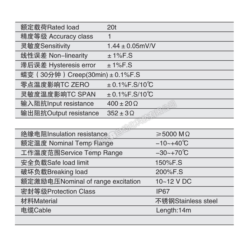 三、XZFL-20t称重传感器产品参数