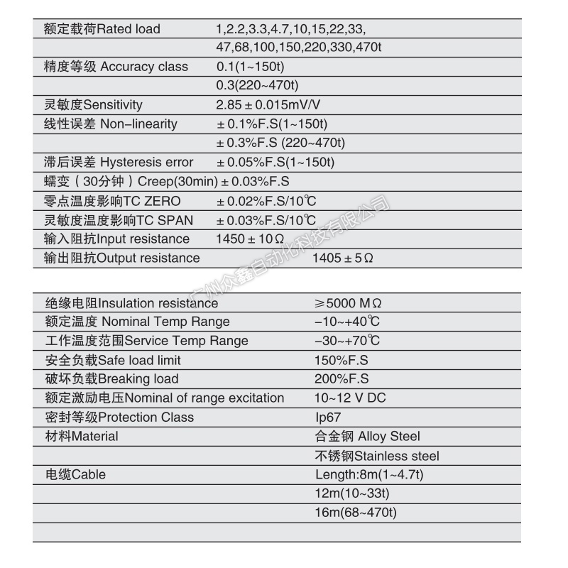 三、NHS-3.3T称重传感器产品参数