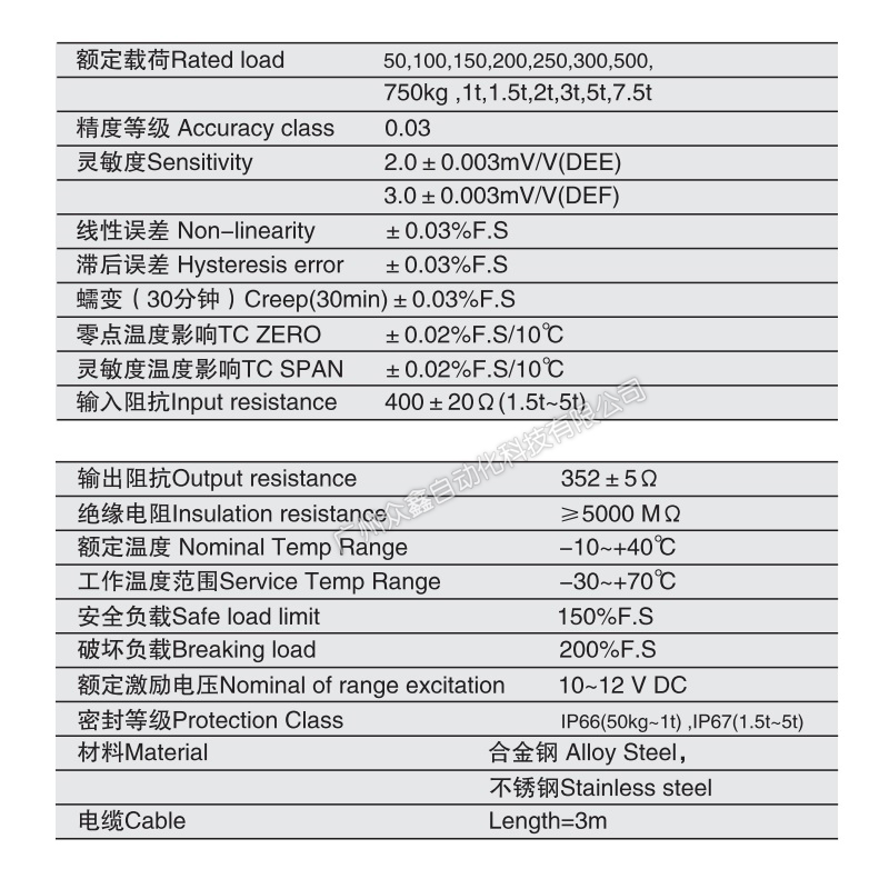 三、DEF-1T称重传感器产品参数