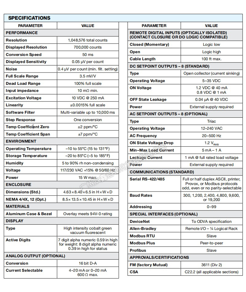 (2)八个继电器输出可用于本地设定点控制,基于通过键盘输入或从主机设备串行下载的设定点值。所有继电器配置和逻辑参数都可以通过前面板键盘选择。使用ASCII和Modbus RTU等标准协议或DeviceNet、Allen-Bradley Remote l/O、Modbus Plus和Proibus等特殊串行接口完成重量、设定值、系统状态和诊断信息的通信。